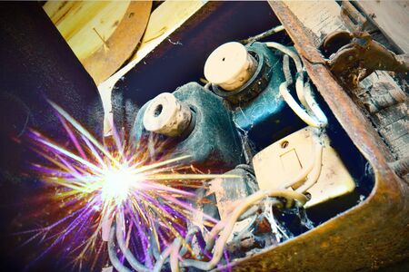 Welding of electrical socket with sparks, close-up.