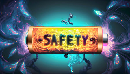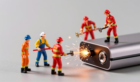 A group of colorful toy firefighters actively engages with a spark emitting from a large battery. Their teamwork highlights a brave effort to control the situation, showcasing drama and action.