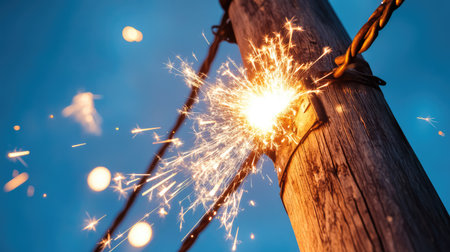 A striking image capturing sparks from a damaged electrical wire, illuminating a dark background with a dramatic glow and bokeh lights. Ideal for highlighting electrical hazards.