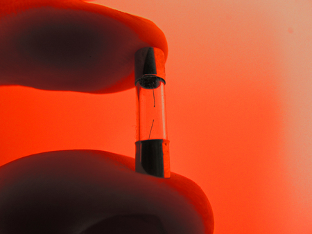 Electric fuses were destroyed in a glass capsule, white background.