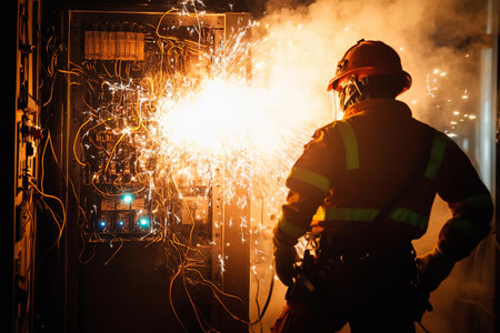 This striking image captures a damaged electric plug emitting flames and smoke, illustrating the critical risks of electrical hazards in homes and workplaces.