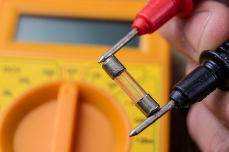 Electric meter and glass fuse. A device for measuring electric current and checking components. Dark background.