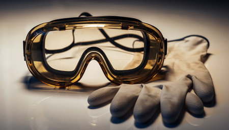 Detailed shot of goggles, amber sunset light illuminating workspace surface