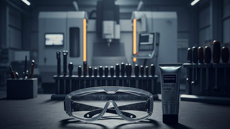 A pair of safety glasses rests on a wooden table in a busy industrial workshop. The blurred background showcases various tools and equipment, emphasizing safety and professionalism.