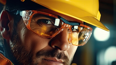 Closeup of Professional Construction Worker Wearing Yellow Hard Hat, Protective Glasses and Gloves. Industrial Safety Equipment Theme, Generative AI