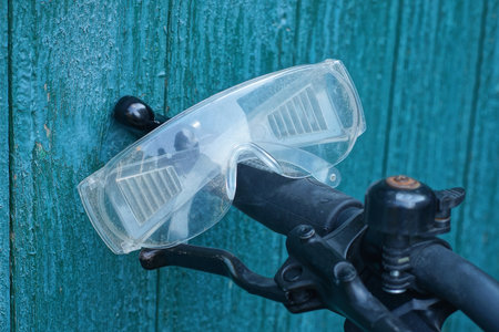 one old gray safety glasses hangs on the black handlebar of a sports bike near a green wall