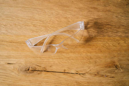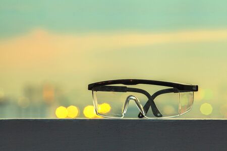 Plastic protective eyeglasses, personal protective equipment to protect against the virus covid-19.
