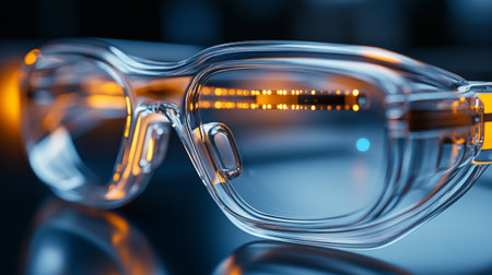 Clear protective eyewear with sleek black arms placed on a shiny wooden table, illuminated by vibrant lab lighting amidst a contemporary setting with softly blurred