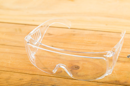 Safety glasses on a wooden bar. Beautiful white background. Copy space.