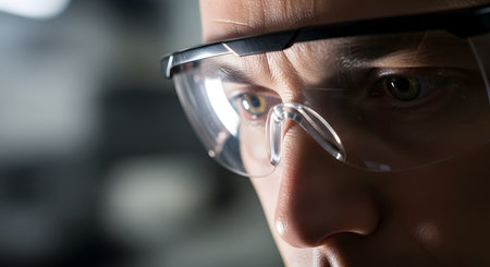 A tight close-up shot of a man's face, focusing on his eye behind protective safety glasses. His intense and concentrated gaze suggests precision work, scientific research, or labor in a factory or laboratory.
