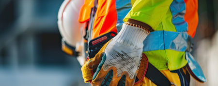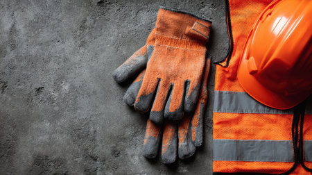 This image showcases essential safety gear for construction workers, including an orange high visibility vest, protective gloves, and a hard hat, all against a concrete backdrop.