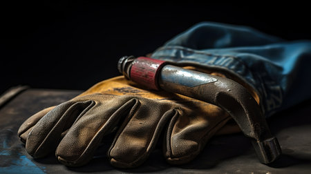 Calloused hands in worn-out gloves reveal the grit and determination of laborers working diligently in a dimly lit workshop, surrounded by tools and machinery, crafting with skill and endurance.