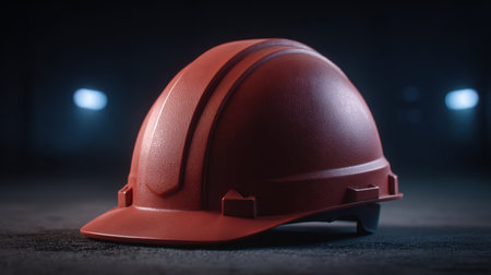 A striking red construction helmet set against a dark, softly lit background. This image highlights the importance of safety and protection in various construction settings. Perfect for safety campaigns or industry-related content.