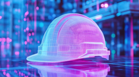 This image features a futuristic digital construction helmet rendered in neon colors against an abstract background, symbolizing innovation and safety in technology.