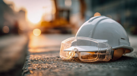 A safety helmet paired with protective glasses rests on rough concrete, illuminated by the gentle glow of early morning light, highlighting the importance of safety proto