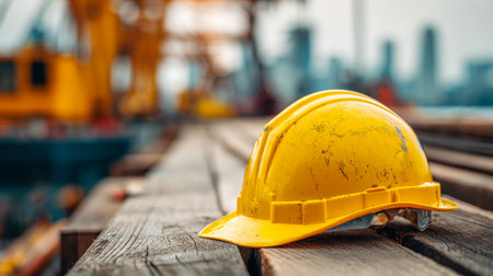 A faded yellow safety helmet rests on aged wooden boards amidst a bustling industrial environment, with machinery and a distant cityscape softly blurred behind.