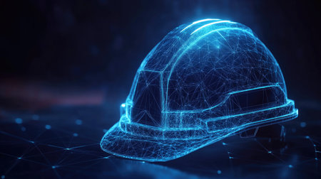 A digital illustration of a construction helmet illuminated by network connections, symbolizing safety and innovation in modern engineering and industry.