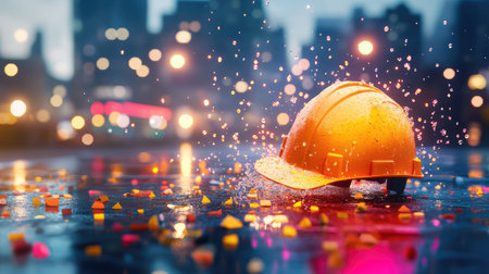 A vibrant orange hard hat rests on a wet urban surface, surrounded by colorful confetti and raindrops. The backdrop features a glowing cityscape that adds a lively energy to the scene.