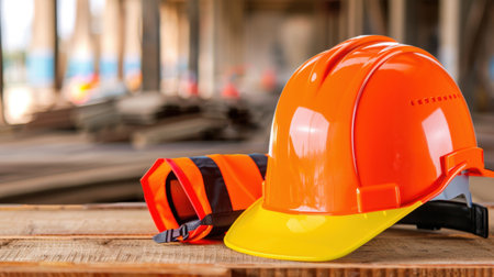 A bright orange safety helmet rests next to a reflective vest on a wooden surface, showcasing essential safety equipment on a bustling construction site.