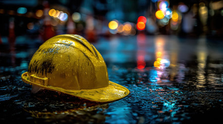 A striking yellow construction helmet rests in a rain-drenched street, capturing the essence of nightlife with soft bokeh lights and vibrant reflections on the pavement.