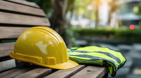 A bright yellow safety helmet rests on a wooden bench beside a reflective vest, symbolizing the significance of safety gear in outdoor work environments.