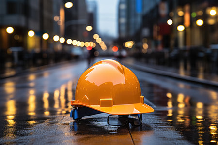 Orange construction worker safety helmet covered in rain droplets is lying on wet asphalt near tools, suggesting work interruption due to bad weather. Generative ai