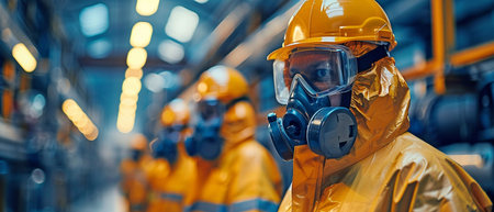 Industrial workers wearing gas masks and hard hats are standing in an abandoned factory