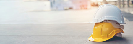 A pair of vibrant yellow construction helmets rests on a concrete surface, representing safety and professionalism in the construction and building industry.