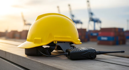 Yellow safety helmet and walkie talkie with container cargo in the background