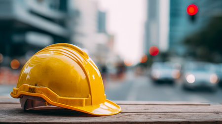 A close-up view of a construction safety helmet resting on a worksite surface, showcasing the essential protective gear in an urban construction setting.