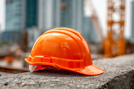 A vivid orange helmet rests on rough concrete amid a bustling construction zone, with city skyscrapers and towering cranes softly blurred behind.