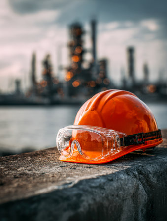A vibrant orange helmet and sleek protective glasses rest on rough concrete amid a bustling refinery, illuminated by the warm glow of evening lights.