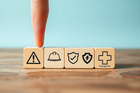 A finger points to wooden blocks displaying safety icons: warning, hard hat, shield, lightning bolt, and medical cross, symbolizing protection and risk management.