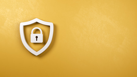 White Shield 3D Symbol Shape with Padlock on a Yellow Plastered Wall with Copy Space 3D Illustration