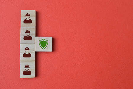 Workers and shield on wooden blocks. Medical insurance, labor safety and health protection