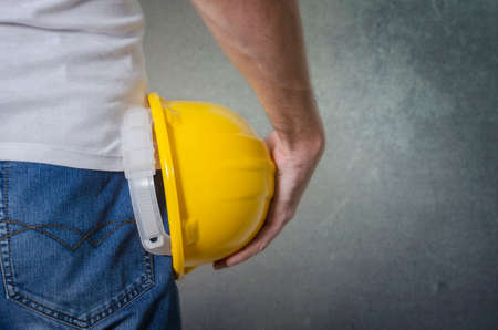 match concept. A worker with a helmet in his hands. A symbol of fatigue and desire to change profession. work burnout. psychological problems. professional crisis. Depression and desire to quit