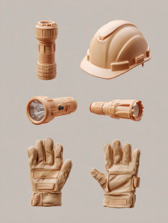 A unique clay-style collection of safety gear includes a helmet, gloves, and flashlight, ideal for construction and outdoor tasks.