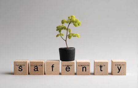 The image features the word SAFETY spelled out with wooden blocks, a small plant, and a white background. The composition uses neutral colors and soft lighting, suggesting a clean and organized indoor setting. This image could be suitable for various uses, including editorial content, presentations, and educational materials.