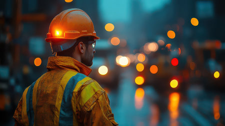 A worker in a safety jacket and hard hat observes a busy construction site during twilight with rain glistening on the roads and lights glowing.