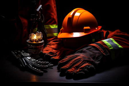 Black wet work boots and helmet on a dark table. Protective accessories for construction workers. Dark background.