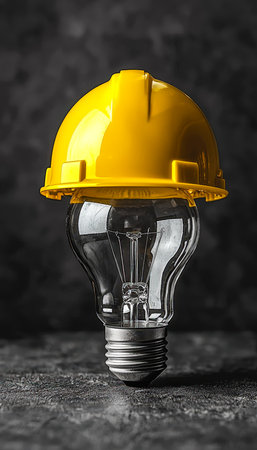 A vibrant conceptual image combining a bright filament bulb with a protective helmet, highlighting workplace ingenuity and safety innovations.