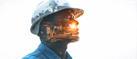 An engineer in a hard hat and blue shirt stands out amid a detailed construction site, showcasing innovative double exposure techniques.