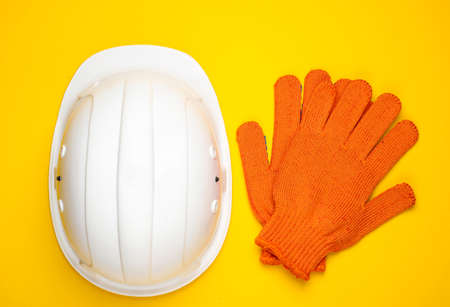 Safety equipment on a yellow background. Construction helmet, gloves. Top view