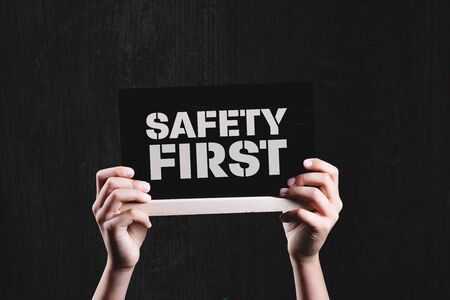 Two hands holding a black placard with the message SAFETY FIRST on an metal background