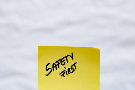 Safety first handwriting text close up isolated on yellow paper with copy space.