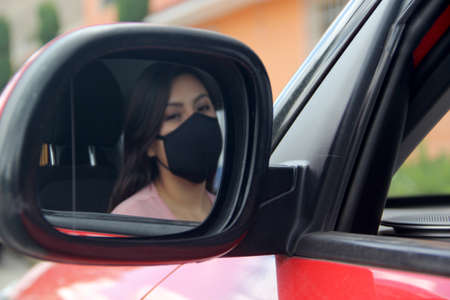 latin woman driver with protection mask in vehicle interior, new normal when driving