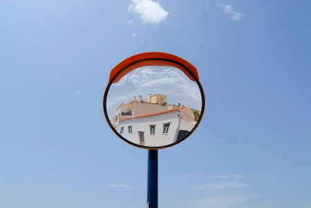 Building reflects in a street mirror in Ferragudo, Portugal.