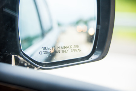 The reflection cars in the mirror of on the road in a foggy overcast day.