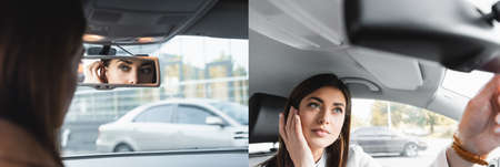 collage of young woman fixing hair and touching face while looking in rearview mirror on blurred foreground, banner