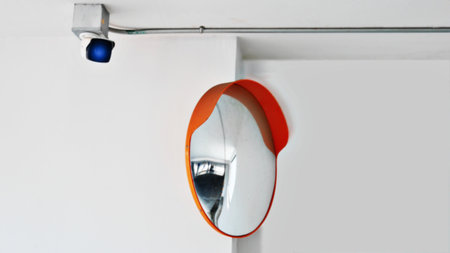 The curved glass with securit camera is installed at the corner of the parking building to prevent accidents from driving in the opposite direction